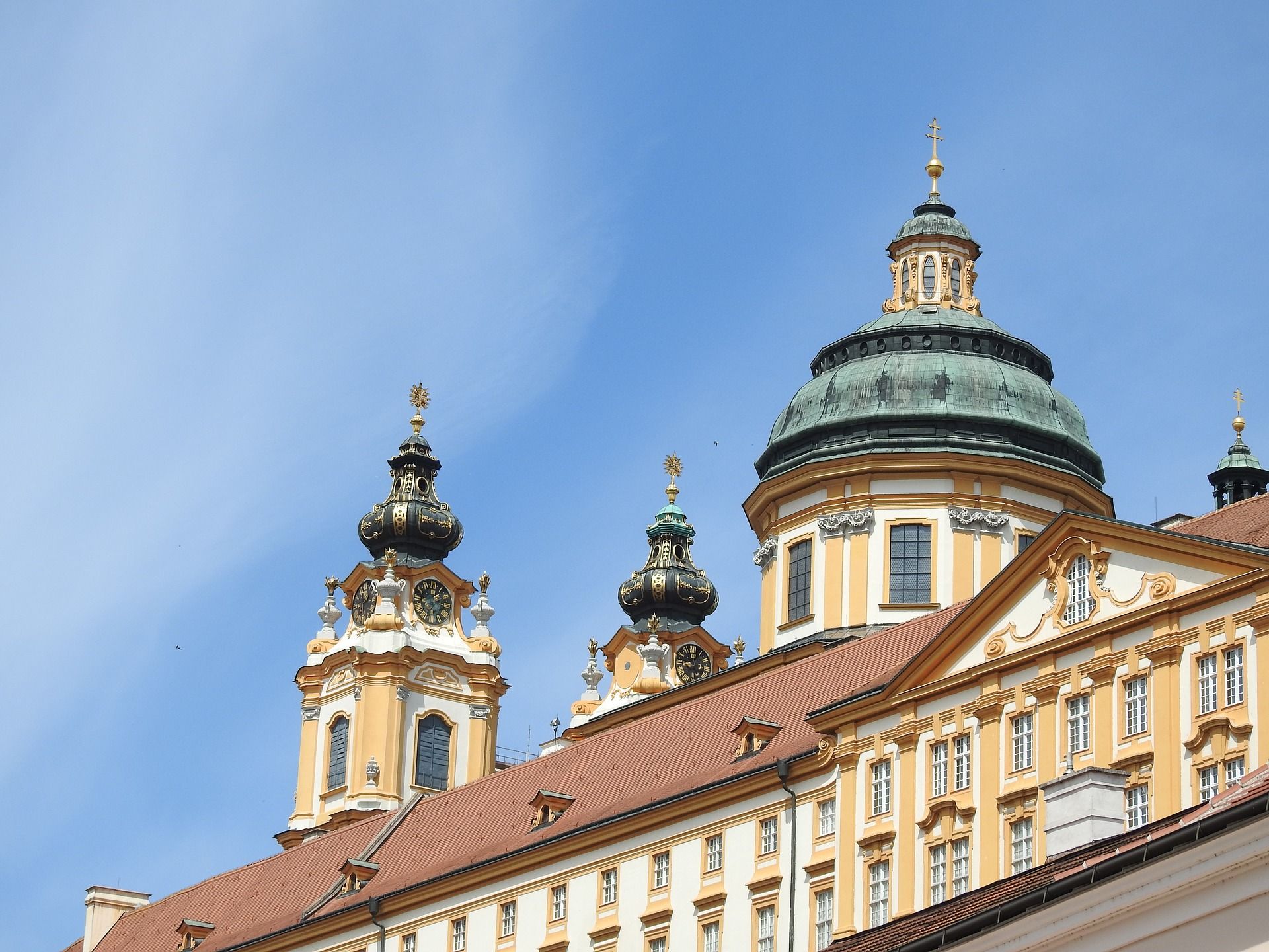 In Nachbarschaft seiner 976 auf einem Felsplateau über der Donau errichteten Pfalz gründete der Babenberger Leopold I. 985 ein Kanonikerstift, das 1089 in ein Benediktinerkloster umgewandelt wurde. Im 14. Jahrhundert zur Klosterfeste ausgebaut war es im 15. Jahrhundert Ausgangspunkt der „Melker Reform“, einer um die strenge Einhaltung der Ordensregel bemühtnen monastischen Reformbewegung. Unter der Regierung Abt Berthold Dietmayrs (1700-1739) erfolgte ab 1702 der großartige barocke Neubau im kongenialen Zusammenspiel von Bauherrn und dem Baumeister Jakob Prandtauer. Ergebnis war eine der bedeutendsten Schöpfungen europäischer Barockbaukunst. Nach beider Tod wurde 1747 mit dem Gartenpavillon die Bautätigkeit im Wesentlichen abgeschlossen. Die Kosteranlage entwickelt sich auf einer durchgehenden, von Ost nach West orientieren, 320 m tiefen Längsachse, wobei die repräsantativen Trakte so angeordnet sind, dass sich ein künstlerische und inhaltliche Steigerung ergibt. Beeindruckt die kompakte, regelmäßig gegleiderte Südfront des eigentlichen Klosters mit ihrer Länge von knapp 200 Metern, so liegt die berühmte großartige Hauptansicht gegen Sonnenuntergang: Über dem zur Donau abfallenden Felsen steigen die, von den Trakten der Bibliothek und des Marmorsaals flankierte, mächtige Doppelturmfassade und die hochragende Vierunskuppel der Stiftskirche auf. Die davor situierte Altane wird von einer rundbogig vorgezogenen, begehbaren Mauer abgeschlossen, durch die eine torförmige Öffnung den Durchblick ermöglicht. In Einklang mit den landschaftlichen Gegebenheiten bildet die wohlproportionierte Bautengruppe eine gelungene Symbiose von Kunst, Kultur und Natur, von Glauben und Wissenschaft. Die malerische Ausstattung der Stifstkirche Hll. Petrus und Paulus und der Respräsentativtrakte wurde von führenden Exponenten der österreichischen Barockkunst wie Antonio Beduzzi, Johann Michael Rottmayr, Paul Troger und Johann Baptist Wenzel Bergl ausgeführt.